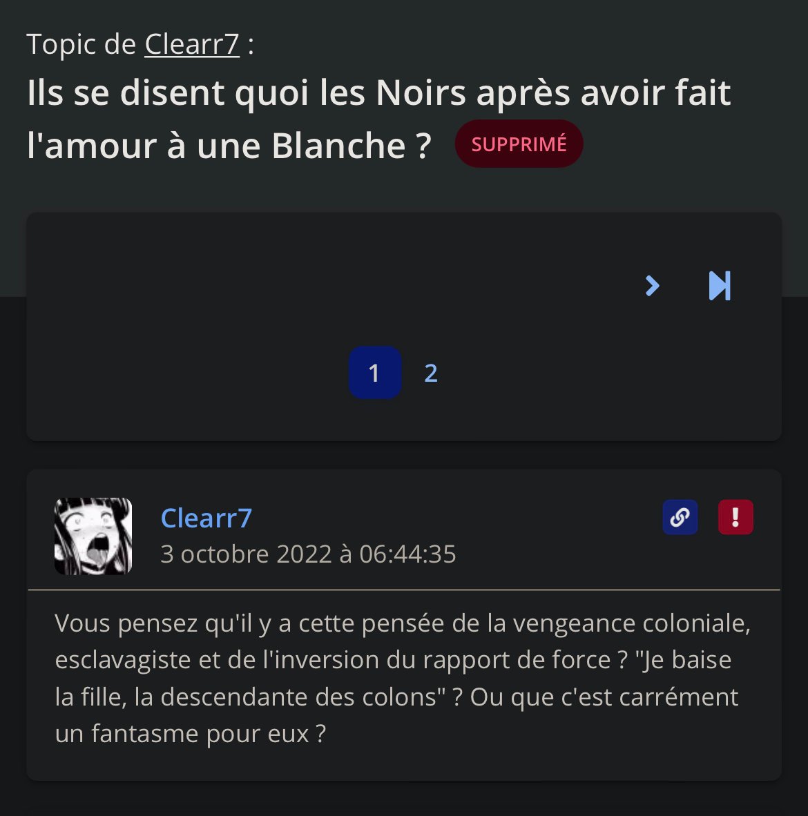 Ne t'énerve pas Clearr7, nous t'apprécions, cependant nous nous inquiétons sur tes propos vis-à-vis des personnes de couleur et ton obsession pour celles-ci dans le domaine sexuel.
