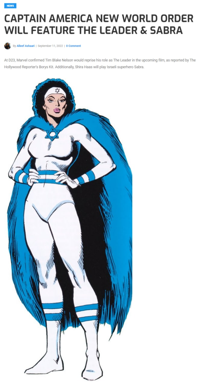 Le nouveau film Captain America sur lequel travaillent Marvel s'appelle "New World Order" et mettra en scène Sabra, une super-héroïne israélienne avec une étoile de David sur la poitrine. https://www.imdb.com/title/tt14513804/ https://twitter.com/StandWithUs/status/1568699204801032193