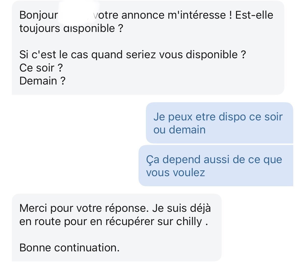 1: FDP vient me voir sur mon annonce pour me dire qu’il est interessé 2: Je reponds a FDP en moins de 10min 3: FDP me rep pour dire qu’il est en chemin pour aller chercher la chose que je vends ailleurs 4: Je veux me venger