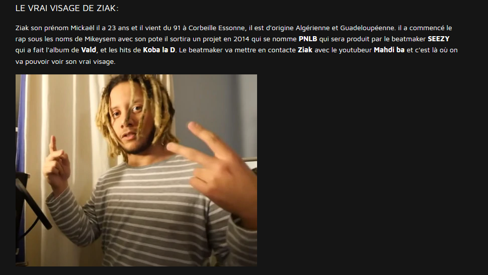 Son ancien nom de scène a d’abord été Mikeysem mais il a choisi de le changer en Ziak https://www.gentsu.fr/rap-fr/artiste/ziak