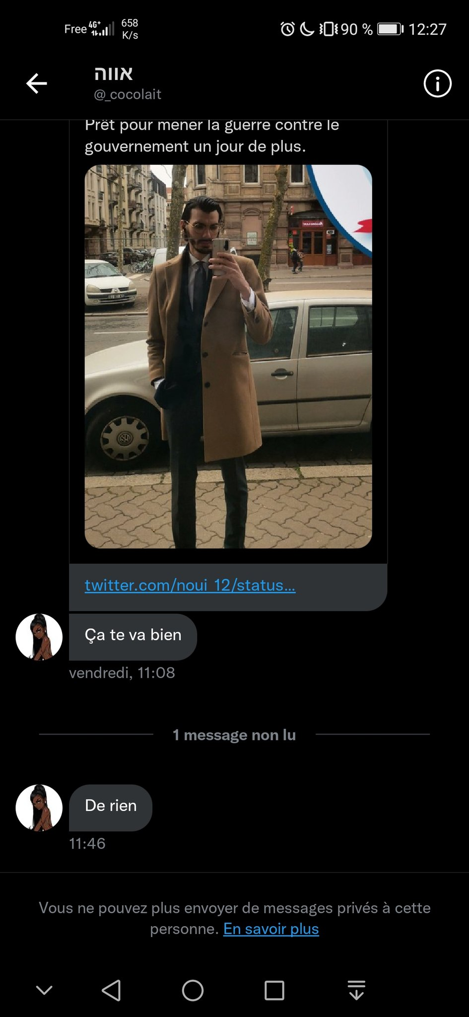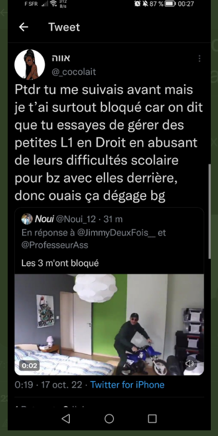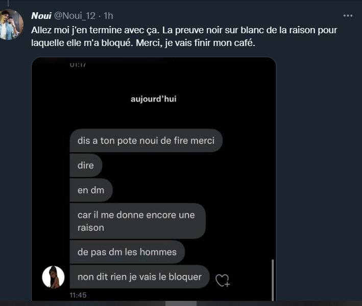 Une meuf l'a complimenté --> il répond pas --> elle rage en disant "bha de rien .." + le bloque --> des mois plus tard elle dit "non mais jlai bloqué pcq il tourne autour de petites jeunes et abuse de sa position" --> il dit qu'il va porter plainte pour diffamation --> elle panique et dit en gros à un(e) ami(e) en message privé "voila ce qui arrive quand on veut draguer un homme ..."