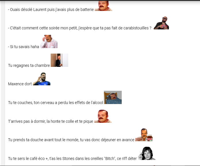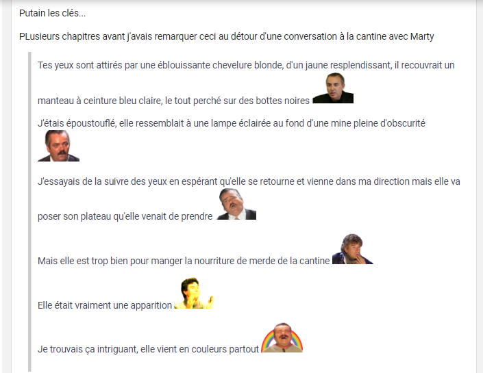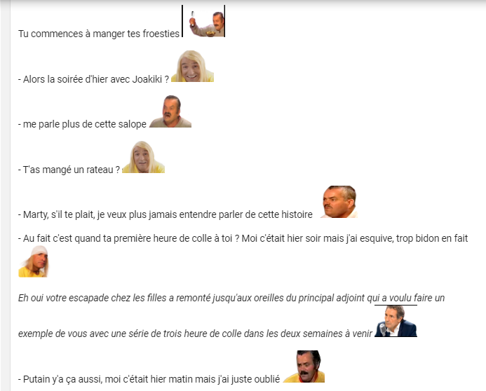 Derien khey, ceci dit, continue comme ça et ponds la suite demain si t'es un vraiment bonhomme khey ! Ne nous fait pas une Joaquina! Nous, les kheys, n'aimons pas l'abandons ni la patience.
