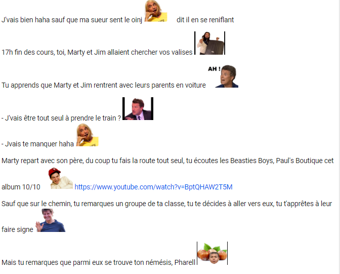 T'as jamais autant eu la rage de toute ton existence car tu sais que si tu continues tu vas être un perdant toute ta vie la... tu as donc pas de fierté en toi ? Tu as beau te sentir bien avec des vrais comme Marty et Maxence, en solo y'a plus personne à part le toi du collège qui est pas encore sorti de son cocon de victime et tu t'en rends compte ...
