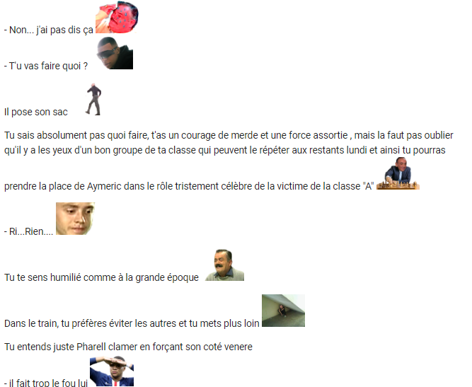 Tu sais absolument pas quoi faire, t'as un courage de merde et une force assortie , mais la faut pas oublier qu'il y a les yeux d'un bon groupe de ta classe qui peuvent le répéter aux restants lundi et ainsi tu pourras prendre la place de Aymeric dans le rôle tristement célèbre de la victime de la classe "A"