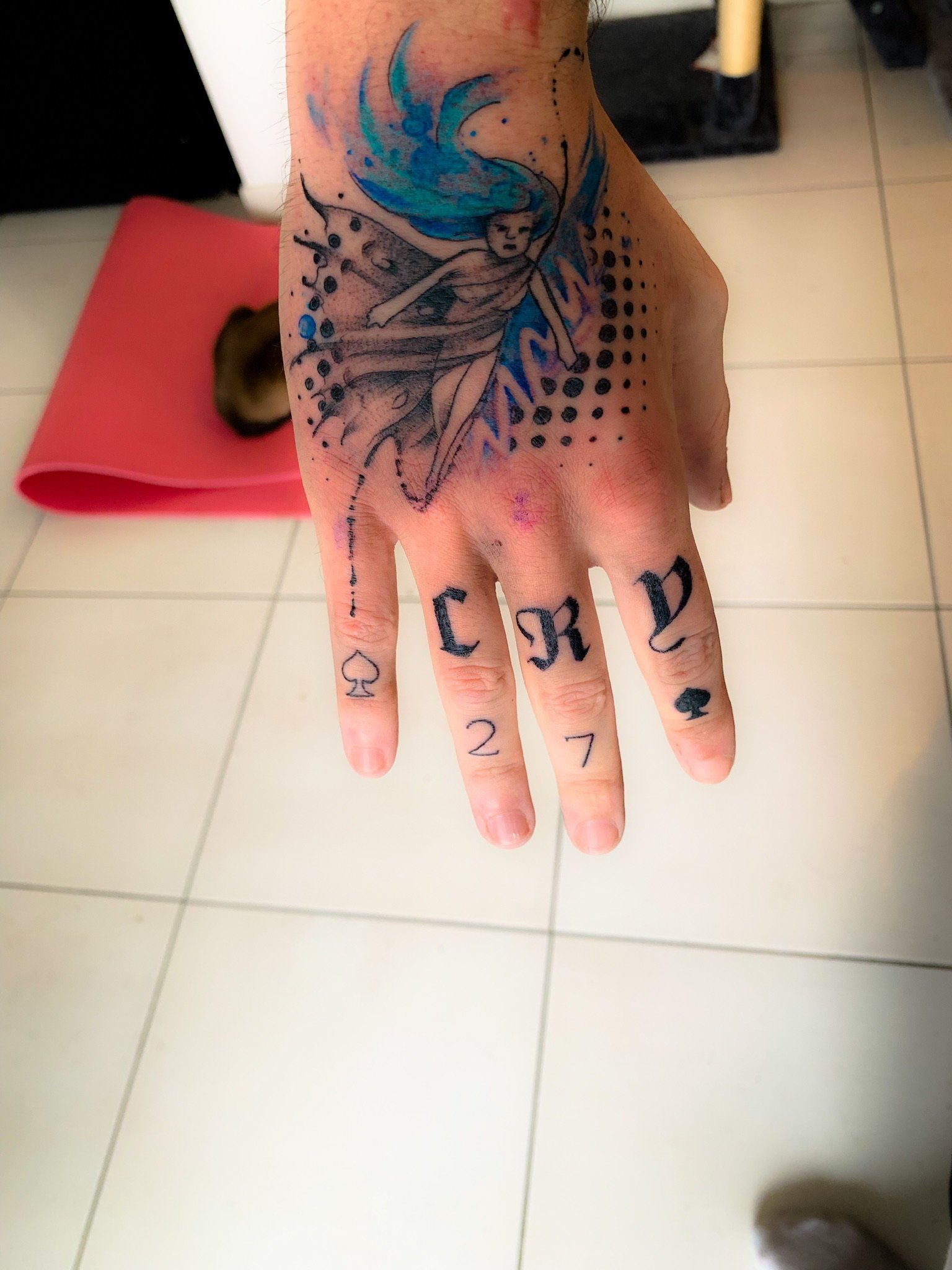 Styles en tout cas clé !J’ai la chance de ne pas avoir mal quand on me tattoo. Du coup mes doigts ont été fait en handpoke (no machine, point par point à la main) + Thnks’..