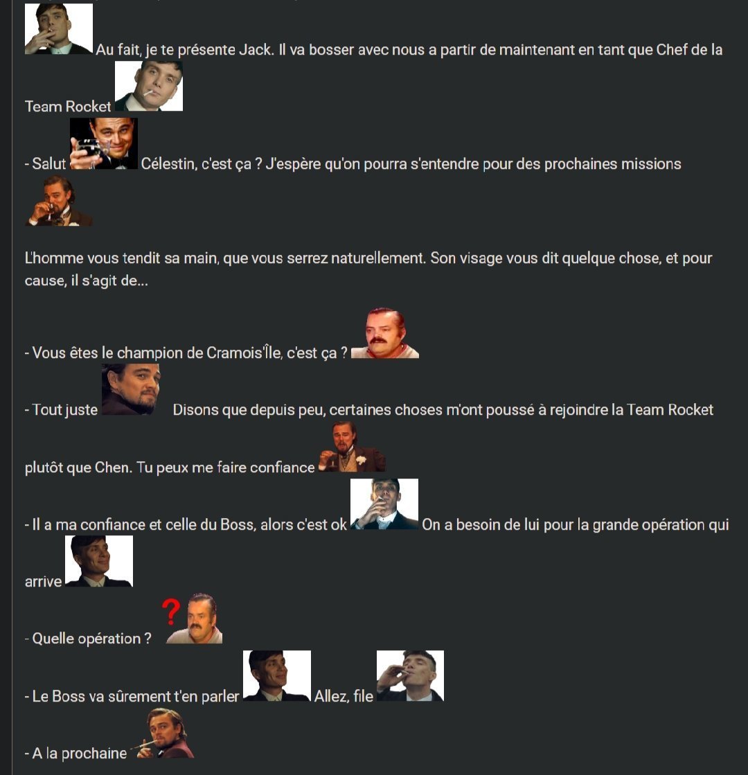 J'viens d'y penser mais vu qu'on est une équipe composé majoritairement de Chef rocket et d'un admin, il y'a moyen que chacun pense à sa gueule et ne suive pas les directives de Célestin qui est censé être l'opérateur de la mission vu que c'est Larry qui lui a confié.