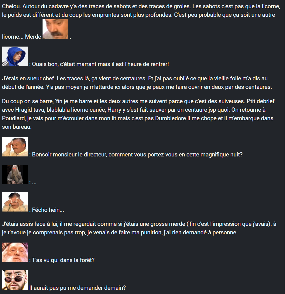 Du coup on se retrouve dans la forêt maudite interdite parce qu'apparemment c'est une super idée d'envoyer des gamins là bas. En plus askip le Hargrid il a trouvé des licornes