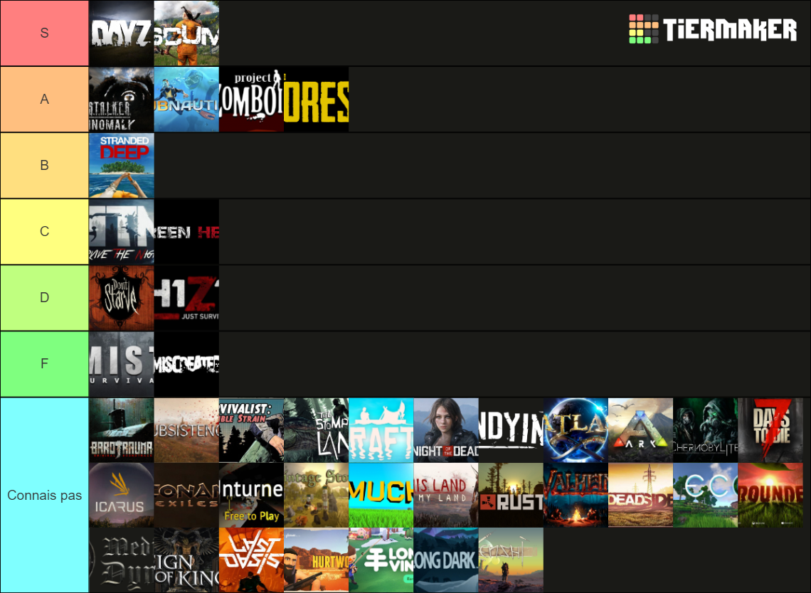 J'aurais bien aimé, malheureusement je n'ai touché qu'à très peu de jeux de survie khey. Donc bon si c'est pour que 95% de la liste soit en "ne connaît pas" autant ne pas perdre de temps