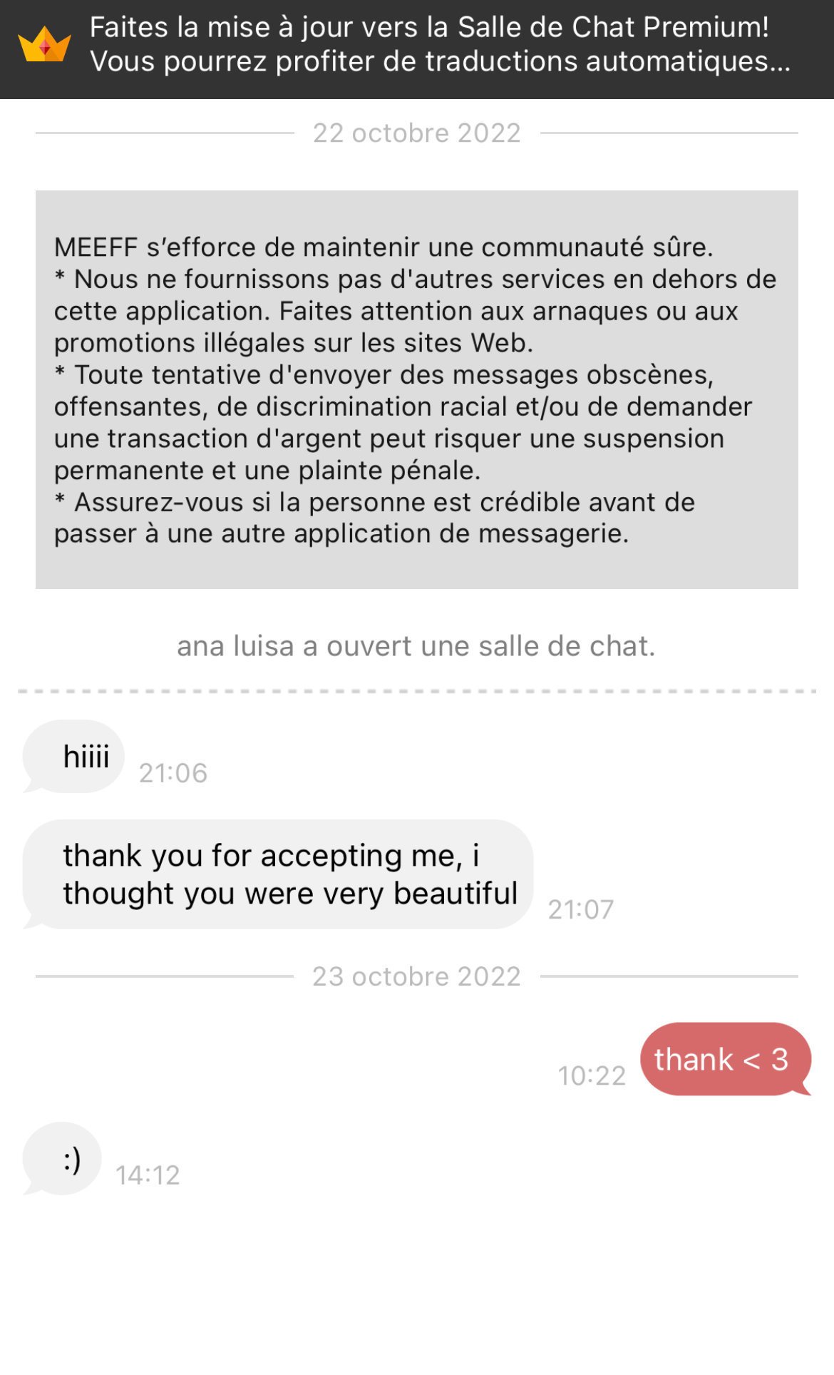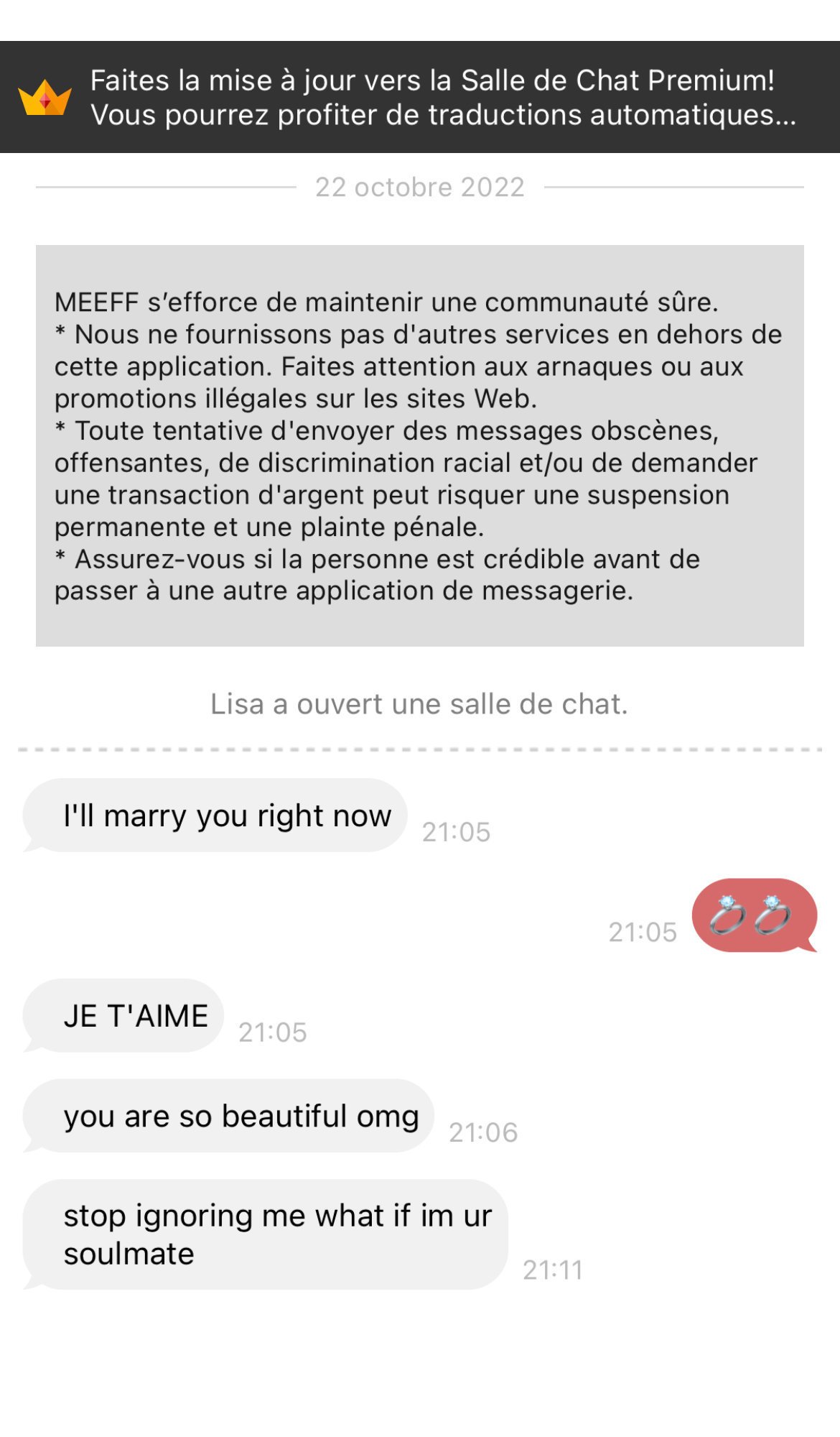 - une autre un peu plus sérieuse, une Hong Kongaise de 40 ans (mais qui en lookait 25 avec le cheat code asiatique), mariée à un Hong Kongais plus vieux (genre 60ans) qui est médecin à l'hôpital, ils ont émigré en Australie y'a longtemps, ils avaient un gosse ensemble, elle apprenait le français, on a commencé en mode normal, en faisant la conversation, et elle a vite commencé à basculer sur des bails genre "mon mari ne me comprends pas, je m'ennuie avec lui" "nous avons les mêmes centres d'intérêts toi et moi, nous nous comprenons"
