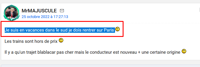 Le 25 octobre 2022 à 17:27:13 :Je suis en vacances dans le sud je dois rentrer sur Paris Les trains sont hors de prix Il y a qu'un trajet blablacar pas cher mais le conducteur est nouveau + une certaine origine