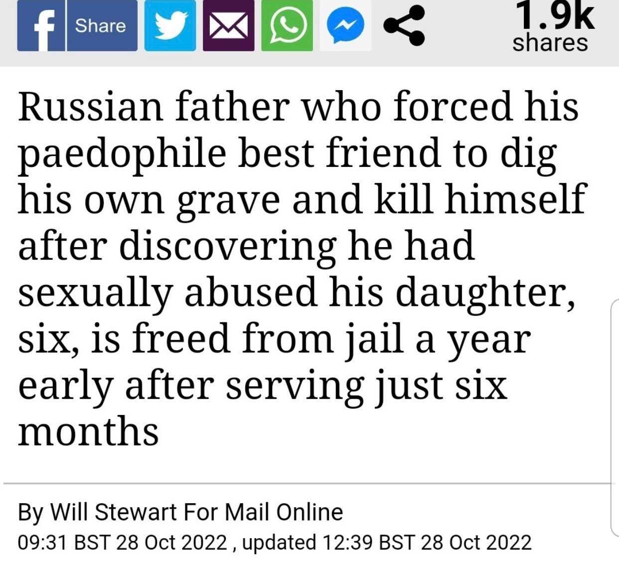 "Un père russe qui a forcé son meilleur ami pédophile à creuser sa propre tombe et à se suicider après avoir découvert qu'il avait abusé sexuellement de sa fille de six ans, est libéré de prison un an plus tôt après avoir purgé seulement six mois"
