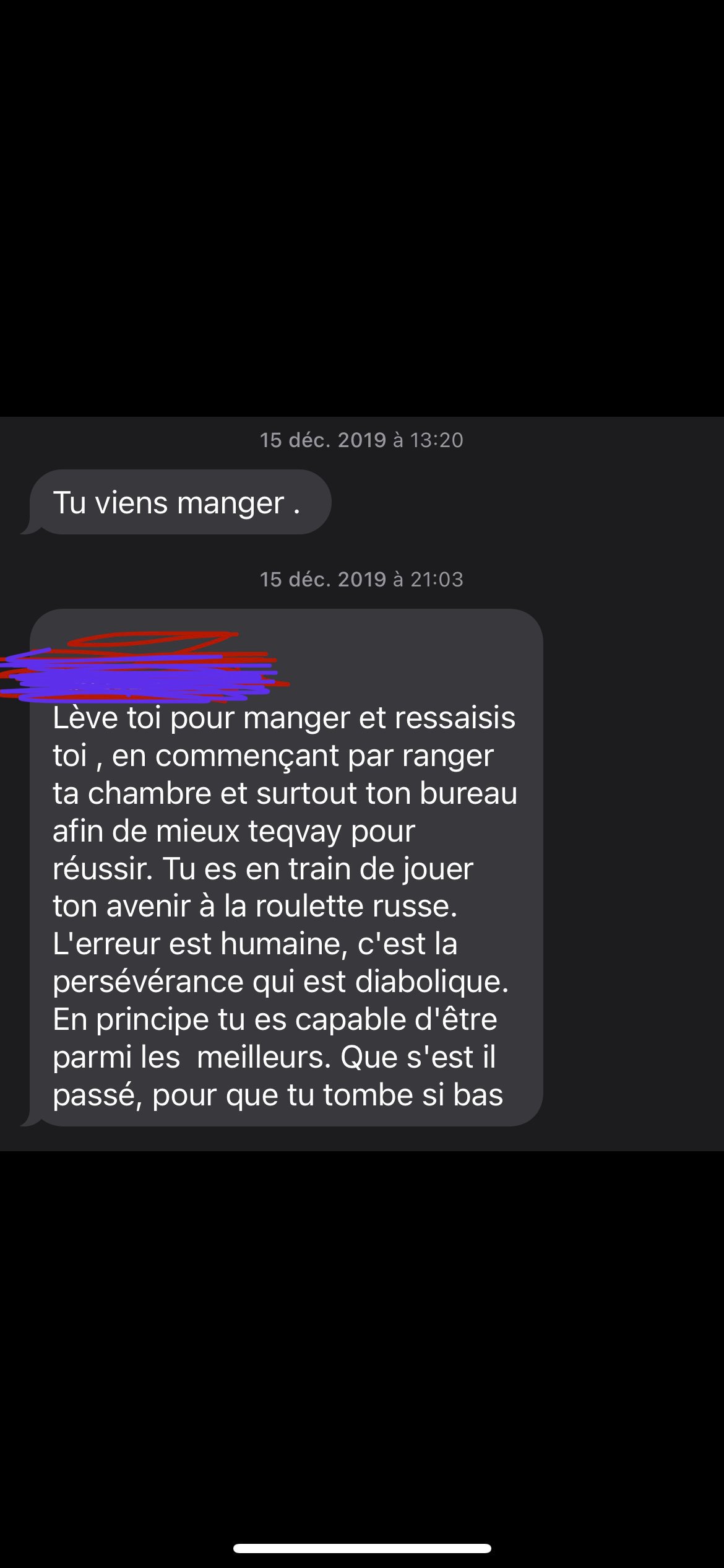 malheureusement après l'euphorie du retour les embrouilles recommencent, et là je suis en cours donc jpp me barrer, c'est durTes parents sont comme les miens, des manipulateurs qui utilisent sans vergogne le chantage affectif pour te faire faire ce qu'ils veulent.