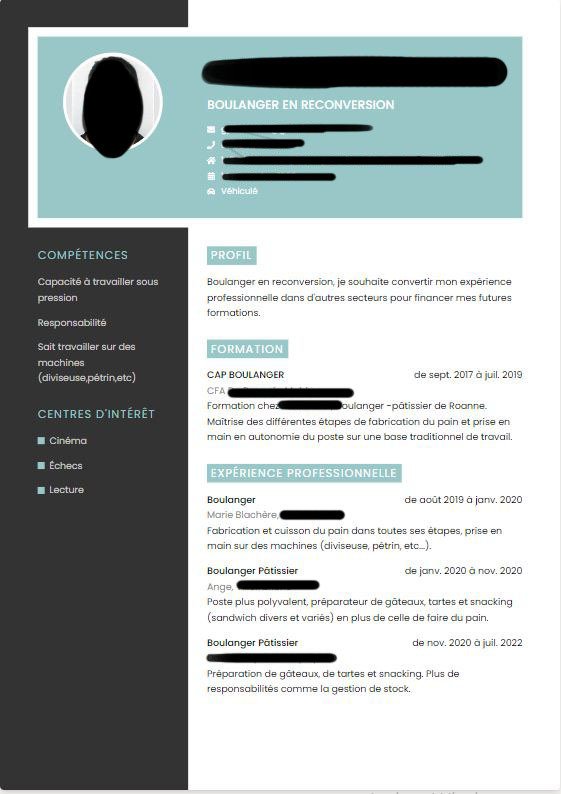 Honnêtement ce n'est pas terrible en plus de ressembler à un CV qu'on trouve sur le site de Pôle Emploi, déjà au niveau des compétences tu devrais commencer par mieux formuler en commençant par un infinitif chaque compétence : "sait travailler sur des machines" > utiliser une diviseuse, utiliser une machine à pétrir.Et concernant les cases formations et expériences professionnelles, laisse les intitulés et récupères les définitions que tu as mises pour les ajouter plutôt au niveau de tes compétences (reformulées bien sûr).