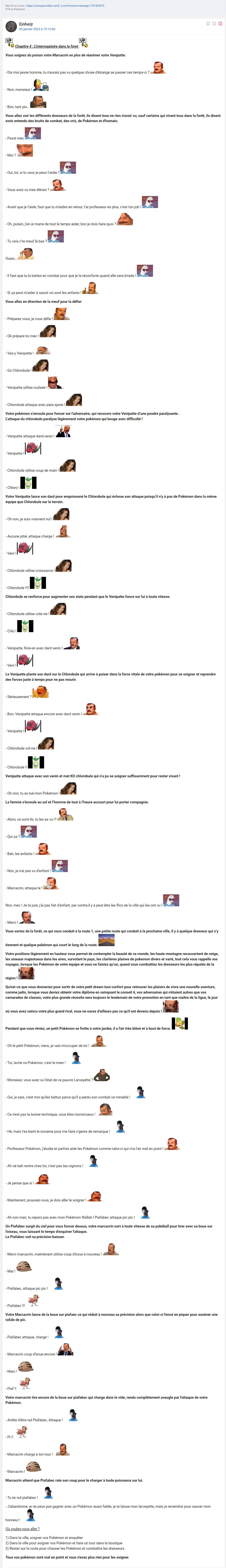 Vous allez voir les différents dresseurs de la forêt, ils disent tous ne rien n'avoir vu, sauf certains qui vivent tous dans la forêt, ils disent avoir entendu des bruits de combat, des cris, de Pokémon et d'humain.