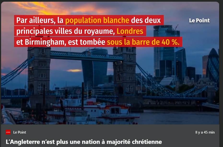 Pour que l'Angleterre reste l'Angleterre ? Attention , a titre personnel je déteste les anglais , mais je vois ce qui se passe dans leur pays comme un laboratoire parallèle de ce qui se passe ne France et qui n'est pas dit vu que ce genre de statistiques ne France est interdit .