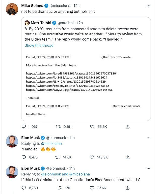 Musk a déclaré que Twitter "agissait sous les ordres du gouvernement pour supprimer la liberté d’expression" alors qu’il publiait des fichiers d’ordinateur portable de Hunter Biden qui montrent des cadres répondant à des demandes de "l’équipe Biden" de supprimer des tweets