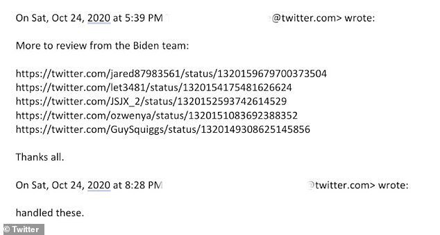 "Plus à examiner de l’équipe Biden", a écrit un membre du personnel le 24 octobre, quelques jours avant l’élection présidentielle, énumérant cinq tweets. "Je les ai manipulés", a répondu un autre trois heures plus tard.