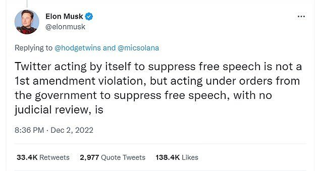 Suite à la foule de messages apparemment accablants, Musk a écrit: "Twitter agissant par lui-même pour supprimer la liberté d’expression n’est pas une violation du 1er amendement, mais agit sous les ordres du gouvernement pour supprimer la liberté d’expression, sans contrôle judiciaire".