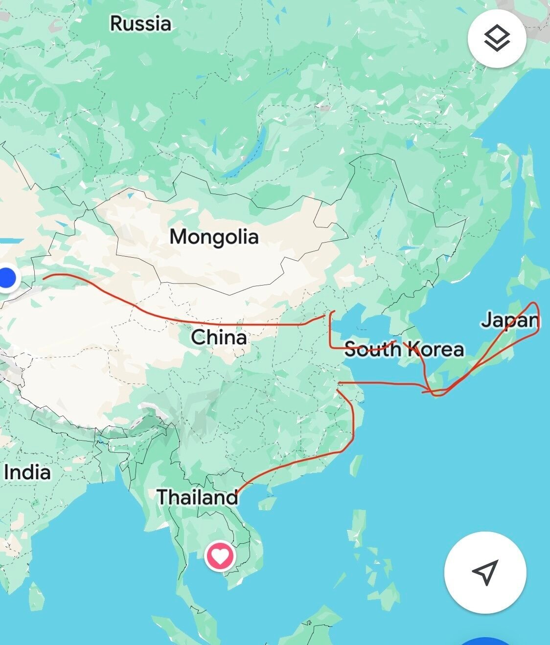Je ne sais pas vraiment, le désert de gobi ça a l’air d’être un sacré truc à traverser en stop. Pékin il fait super froid aussi, fin bref j’y serai bientôt. Voici mon itinéraire pour les prochains mois je pense