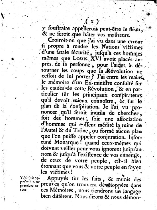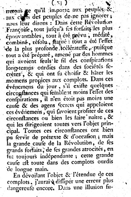Appuyé sur les faits, & munis des preuves qu'on trouvera développés dans ces Mémoires, nous tiendrons un langage bien différent. Nous dirons & nous démontrerons ce qu'il importe aux chefs des peuples de ne pas ignorer ; nous leur dirons : Dans cette Revolution tout a été prévu, médité, combiné, résolu, statué ; tout a été l'effet de la plus profonde scélératesse, puisque tout a été préparé, amené par des hommes qui avaient seuls le fil des conspirations longtemps ourdies par des sociétés secrètes & qui ont pu choisir & hâter les moments propices aux complots...