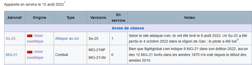 Le seul avion de chasse (un SU-25) livré par la Russie s'est craché quelques jours après la livraison : http://www.opex360.com/2022/10/04/un-avion-dattaque-su-25-frogfoot-malien-sest-ecrase-a-gao/