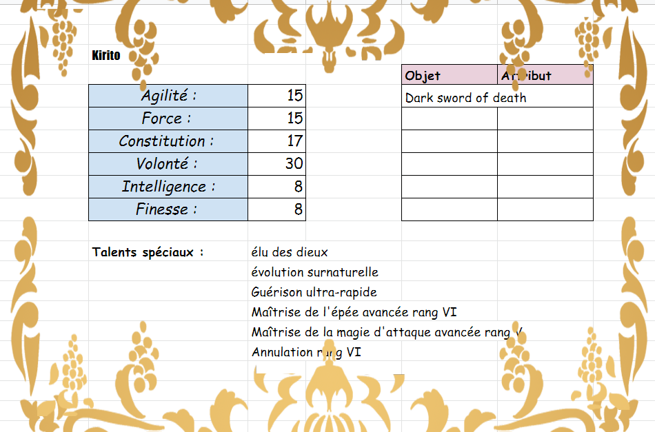 Pour les stats de Kirito c'est pas moi qui les ai je dois aller demander à la succube.