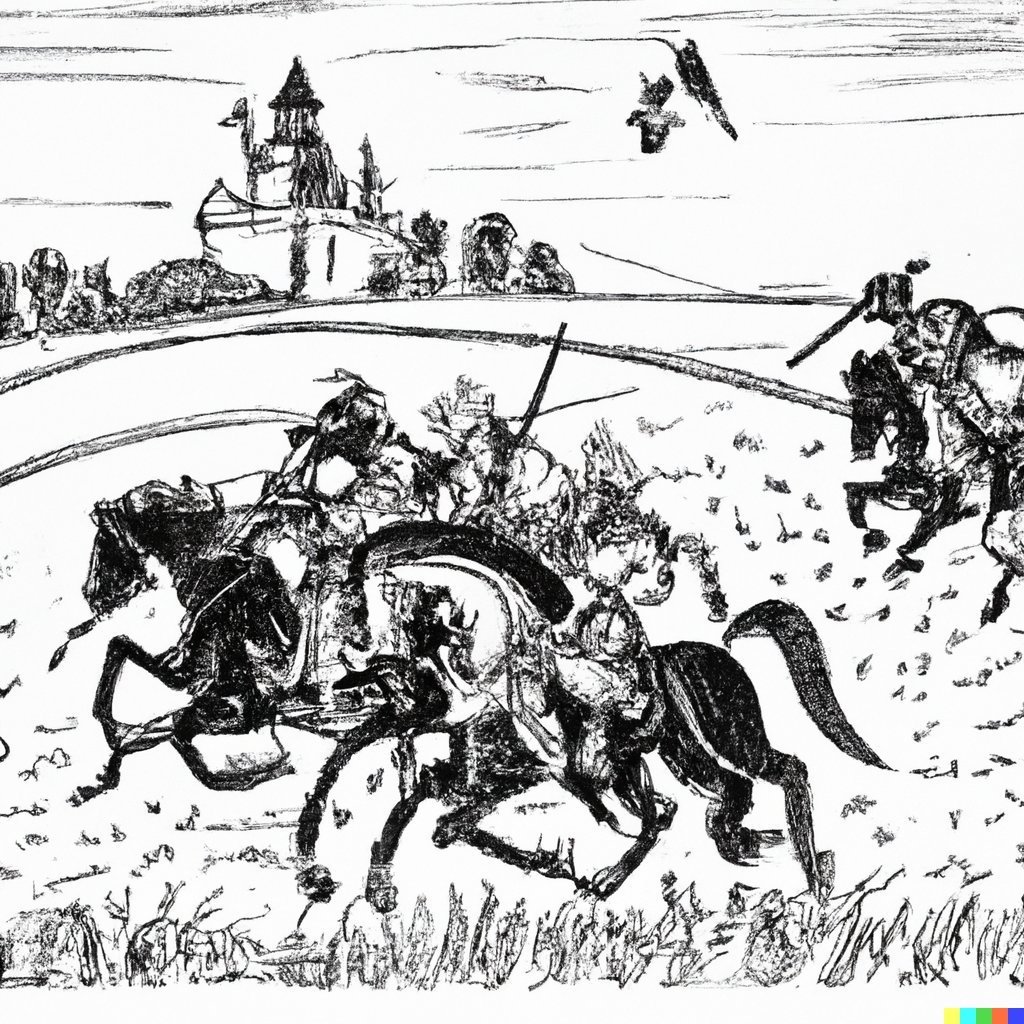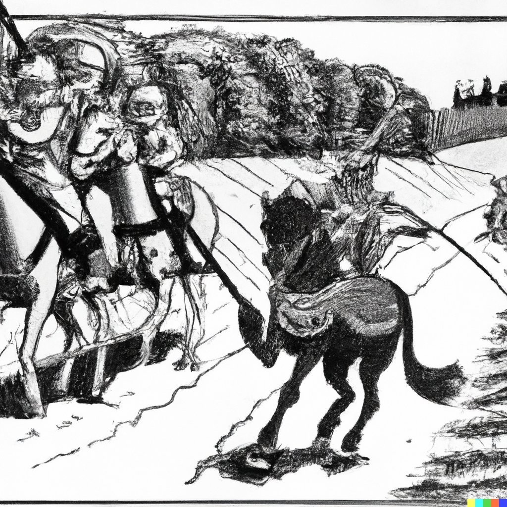 Le 26 décembre 2022 à 11:49:55 :Des hussards français se battent contre des bandits de grand chemin en style gravure médiévale