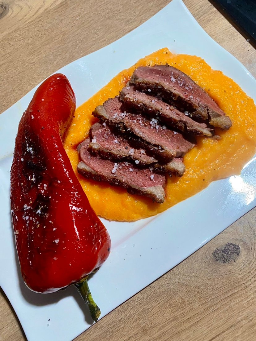 C’est une simple purée de pommes de terre et de carottes à laquelle j’ai ajouté un peu de lait et que j’ai faite au mixeur plongeant pour qu’elle soit onctueuse presque en velouté
