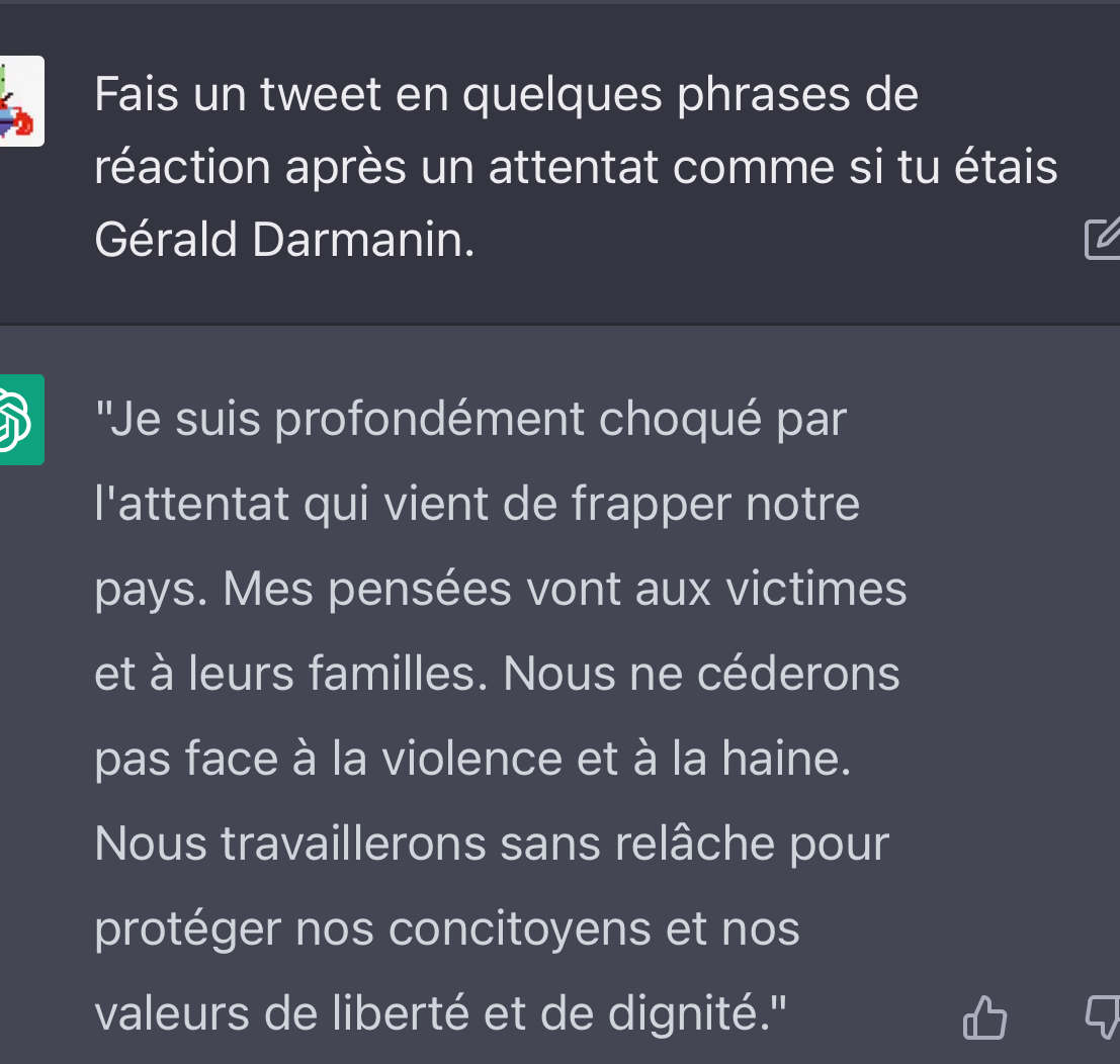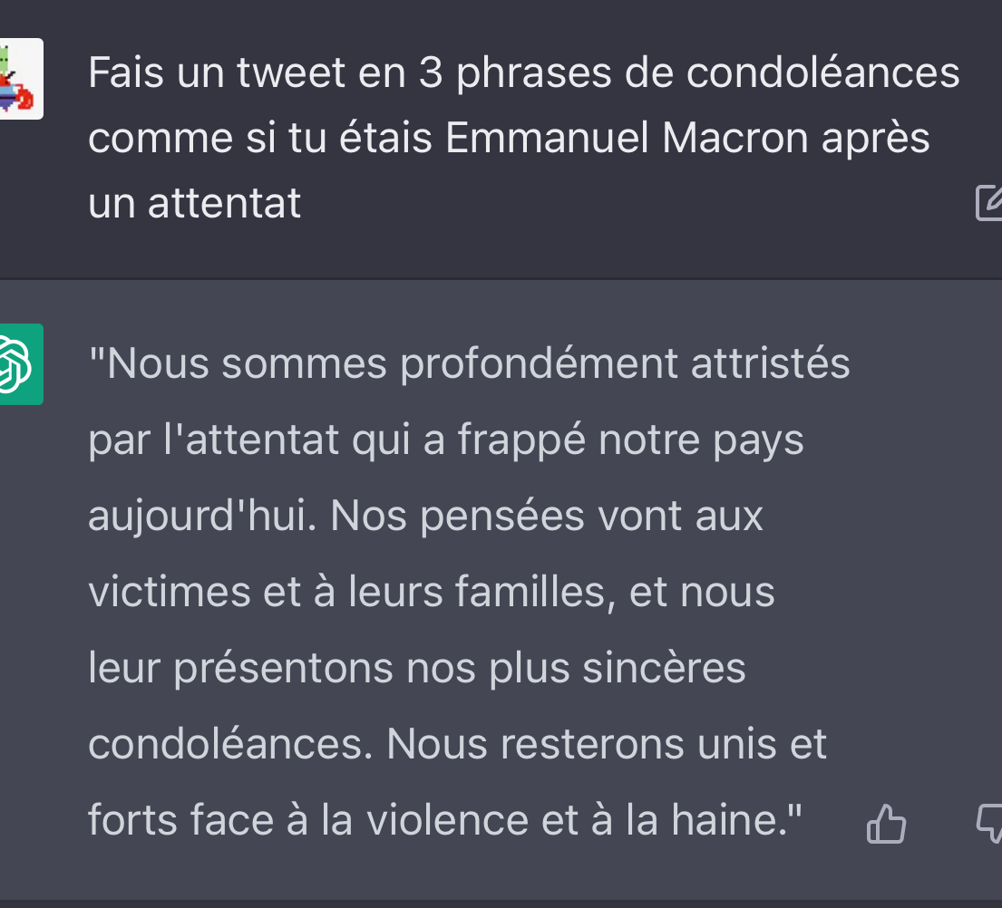 Le 23 décembre 2022 à 18:19:52 :Le 23 décembre 2022 à 18:19:17 :l'ia va rechercher directement sur internet les premier résultat et t'en fait un copier coller donc c'est l'inverseMacron est une IA ?