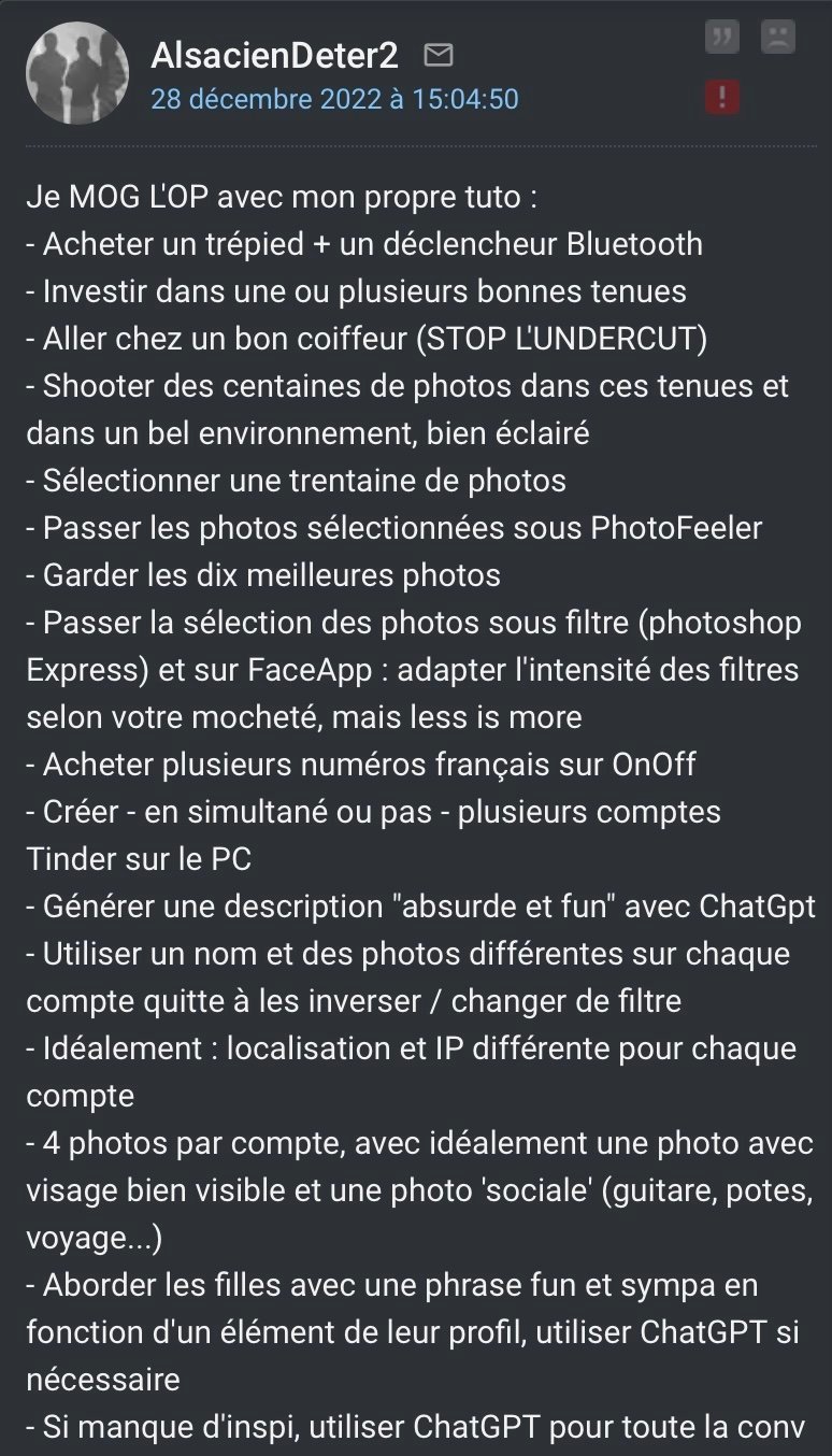 Si certaines choses sont logiques oui d’autres sont plus surprenantes (le check du compte FB, la vitesse pour swiper, la consultation des profils…). Je pense que beaucoup flinguent leurs comptes dès le départ et abandonnent alors qu’avec la bonne méthode, certes ils ne vont pas avoir un succès de fou s’ils ont un physique peu avantageux mais au moins ils auront une chance.
