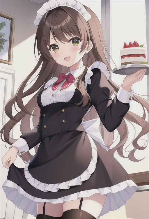cheveux châtins et ondulés, si possible serveuse d'une brasserie élégamment habillée en noir et blancEn train de porter un plateau, toute souriante, les yeux très doux, un peu comme elle