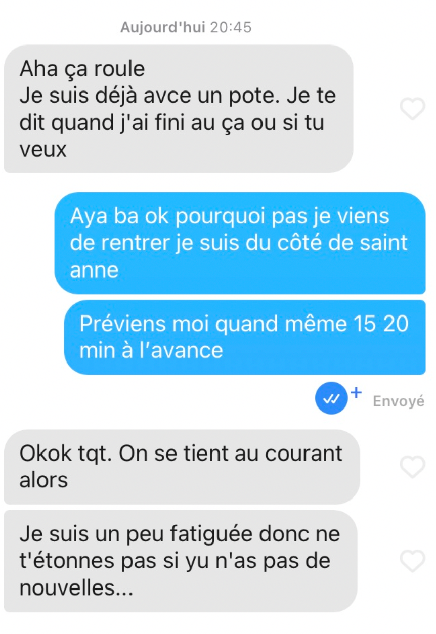 En ghost pour le moment, mais en vrai elle m'a envoyé le premier message tout à l'heure à 19h, j'ai répondu en mode balec et là je me dis pourquoi pas sortir... y'a rien de calculé hein