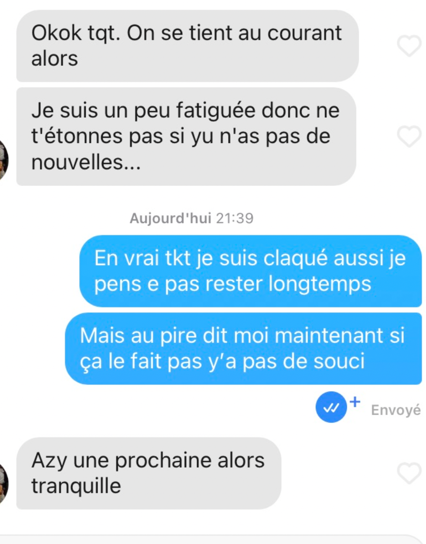 Okay bah dit que c’était ta dernière dispo ce soir donc toi si jamais t’es toujours op pour ce soir mais sinon ça va être compliqué
