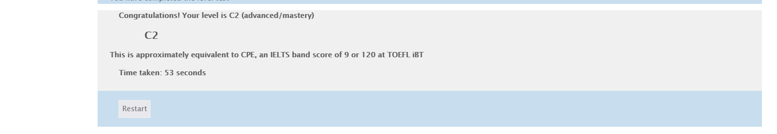 Content, même si un C2 m'aurait fait très plaisir. N'empêche c'est avec ce genre de test (bien qu'assez court) que je me rends compte de la difficulté d'atteindre un C2. Je regarde des youtubers anglophones, joue à des jeux vidéos en anglais depuis quelques années déjà et ait lu plusieurs œuvres de fictions dans cette langue en plus d'avoir passé un temps considérable sur des forums de discussions américains et internationaux. Pourtant pas moyen d'atteindre le C2.