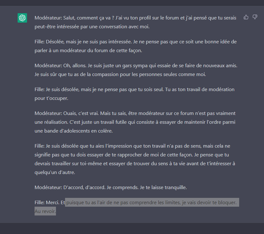 : Peut-être, mais je préfère passer mon temps à des activités plus significatives. Je suis désolée, mais je vais devoir te bloquer maintenant. Bonne chance pour ton travail de modération.