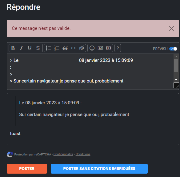 Comment ça marche ? Le script ajoute un deuxième bouton pour poster qui supprime automatiquement les citations imbriquées SAUF la citation principal