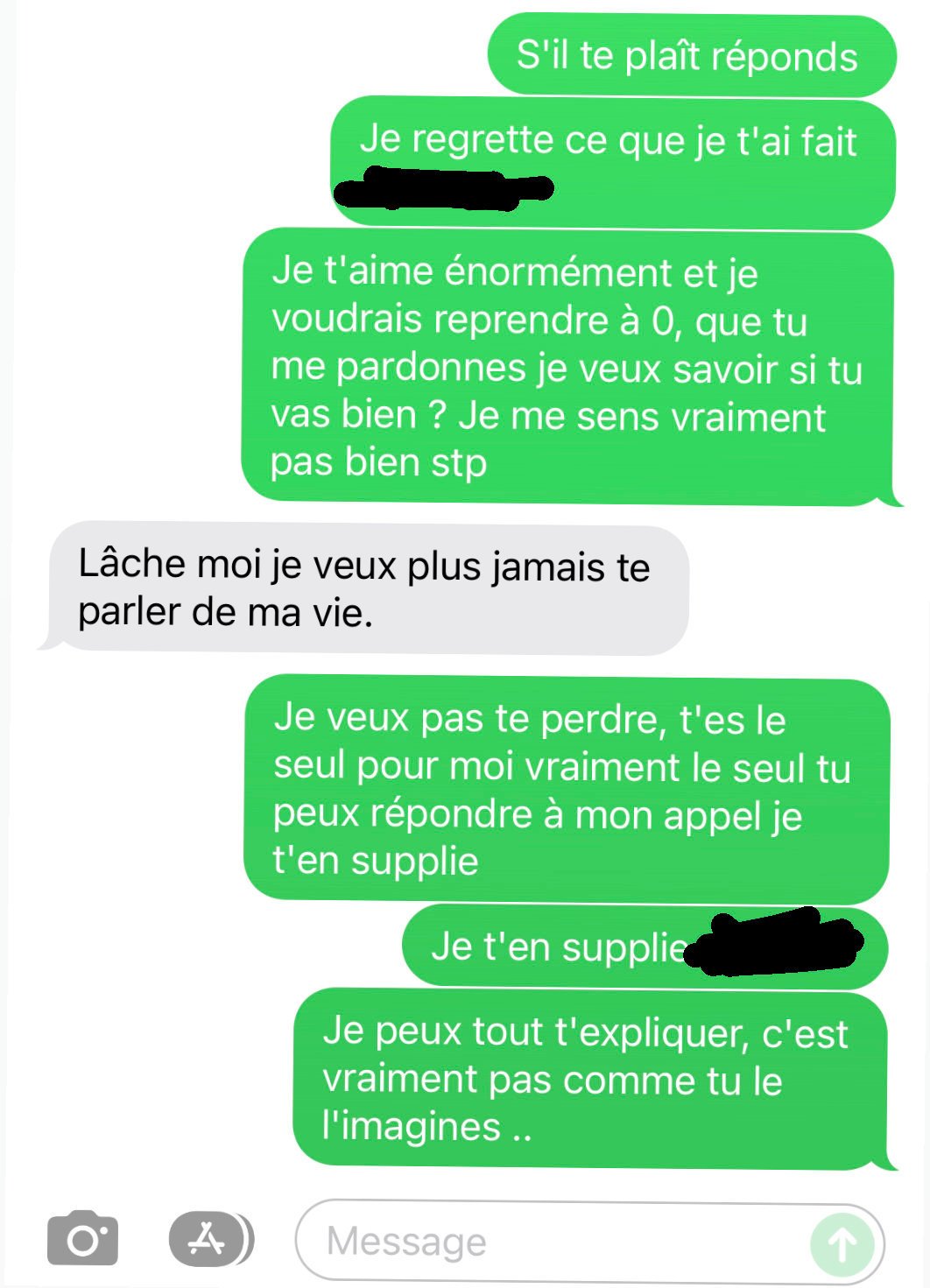 Et là c’était le drame au réveil je regrette énormément et je suis directement parti de son appartement, je me sentais sale pendant des semaines j’ignorais ce mec qui au final ne voulait que mon corps car ça ne le déranger plus il ne me faisait plus aucune avance rien .. et je pensais encore à mon copain et ce que j’ai fait alors j’ai décidée de lui avouer la vérité et actuellement il ne veut plus me parler que faire ? Notre conversation actuellement.. je crois que c’est foutue les kheys