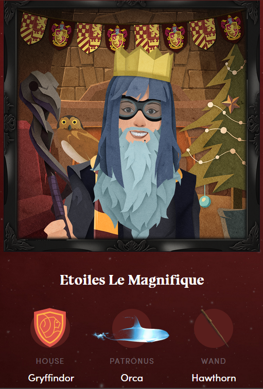 Pareil et au lieu de ça ces no taste m'ont collé à Gryffondor et ce avec un patronus épaulard ainsi qu'une baguette d'aubépine laquelle irait de préférence aux "wierdos" :