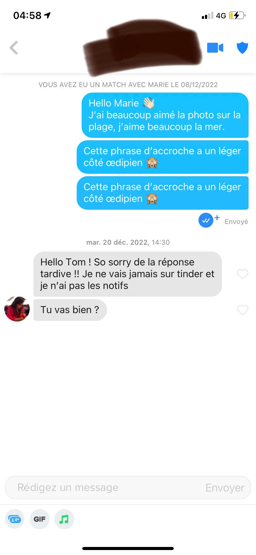 Et j’ai pas besoin de forcer. Tu remarqueras que je ne réponds même pas à mes matchs Tinder des qu’il y a trop de délais :