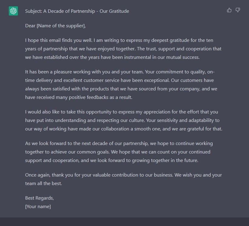 Exemple : mail de félicitations pour 10 ans de partenariat avec un fournisseur