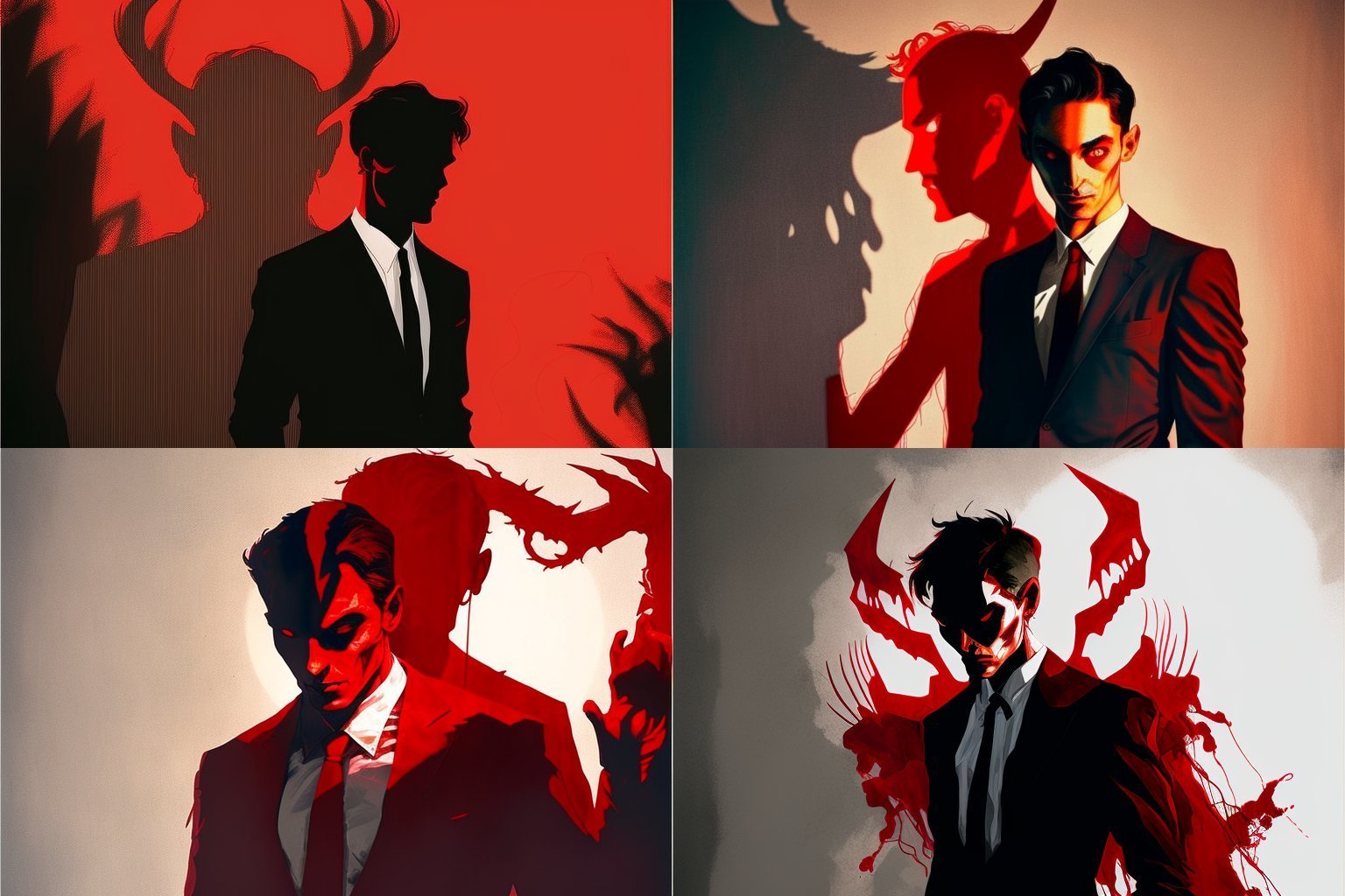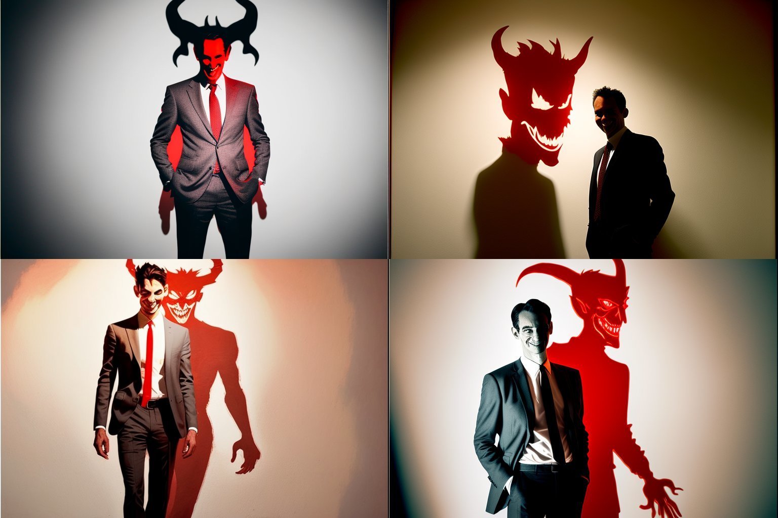 Picture of a medium height dark haired man in front of a white wall, he is wearing a suit, he is tying his tie, behind him a large shadow is emerging and taking the shape of the devil, a dark red light is emanating from the shades and goes to all sides