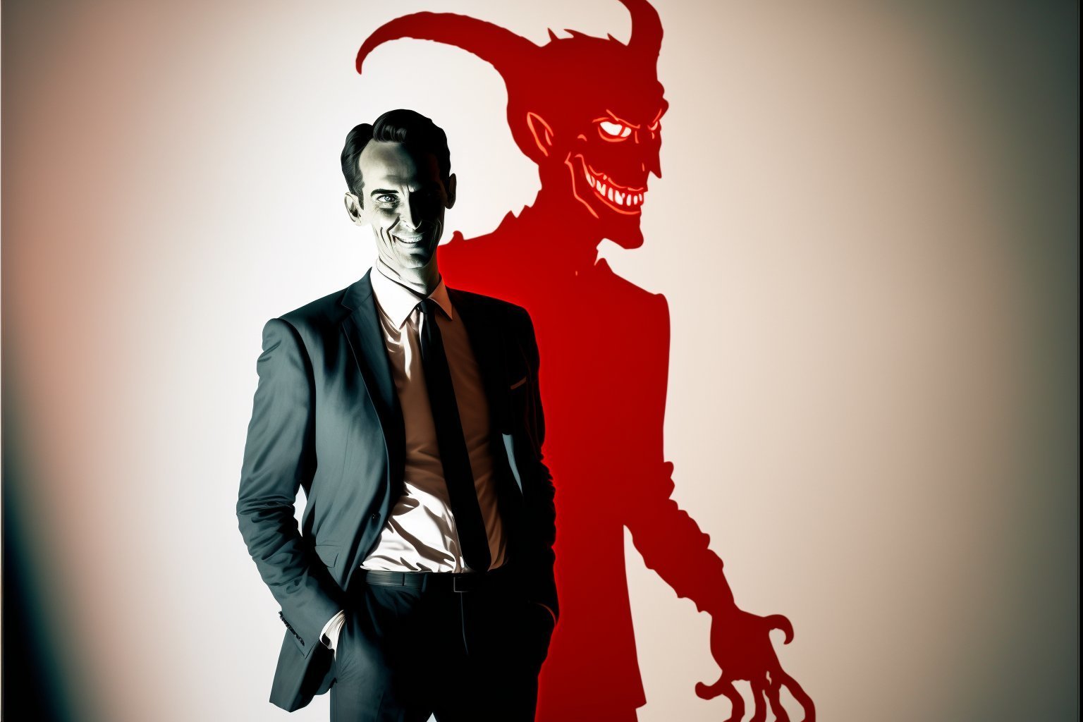Full body picture of a medium height dark haired smiling man in front of a white wall, he looks like a very nice person, he is wearing a suit, behind him a large shadow is emerging and taking the shape of the devil, a faded red light is emanating from the shades
