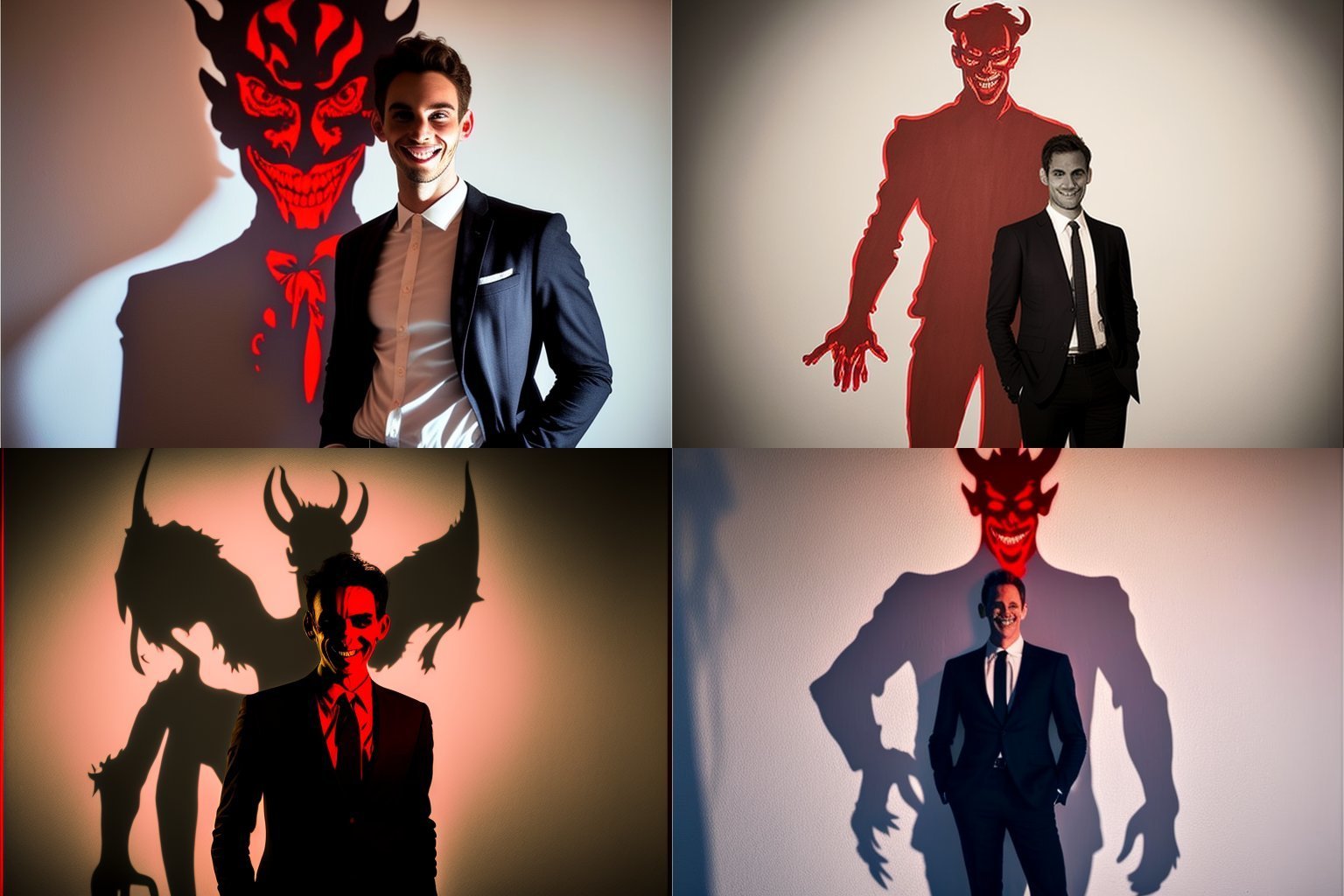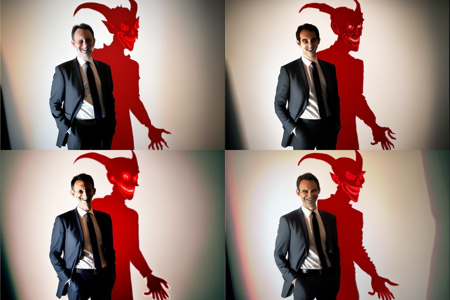 > > > Picture of a medium height dark haired man in front of a white wall, he is wearing a suit, he is tying his tie, behind him a large shadow is emerging and taking the shape of the devil, a dark red light is emanating from the shades and goes to all sides