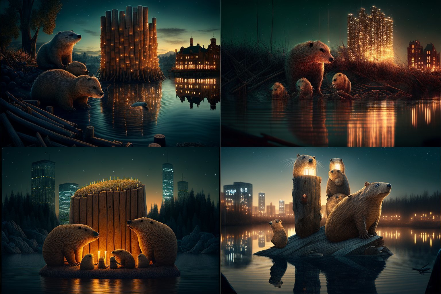 > > > > > A family of gigantic beavers living in a major city at night, they are using illuminated skyscrapers as logs to build their dam