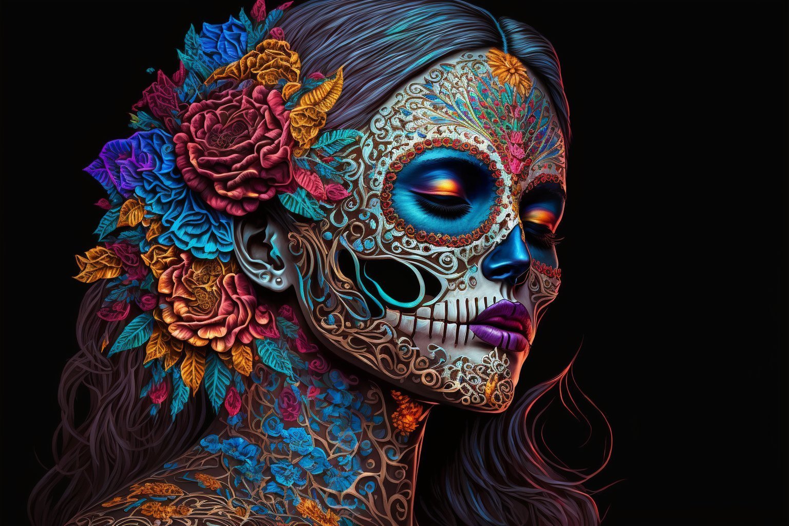 woman, Dia de los Muertos, glowing colors, highly detailed, ultraquality --ar 3:2