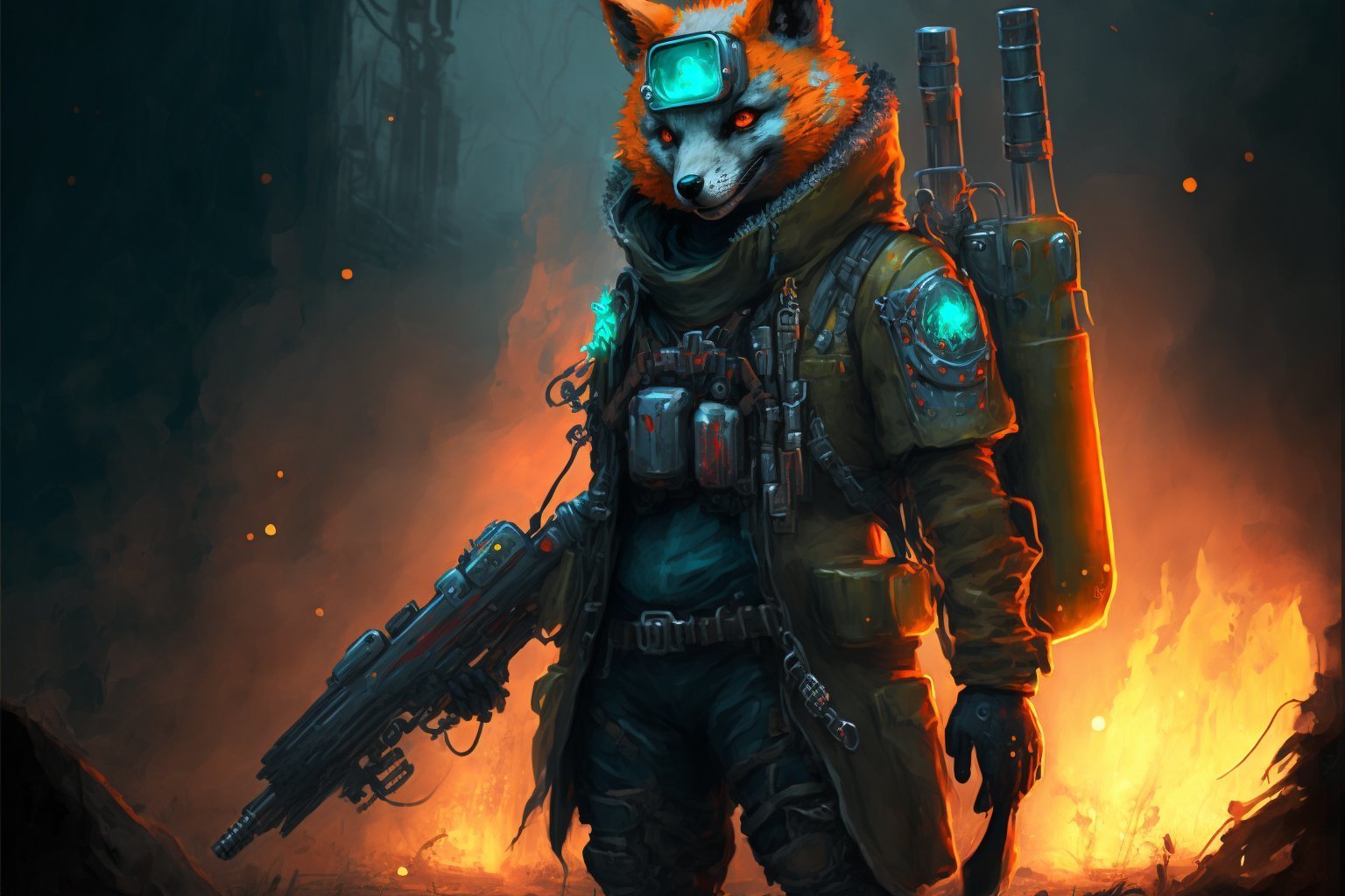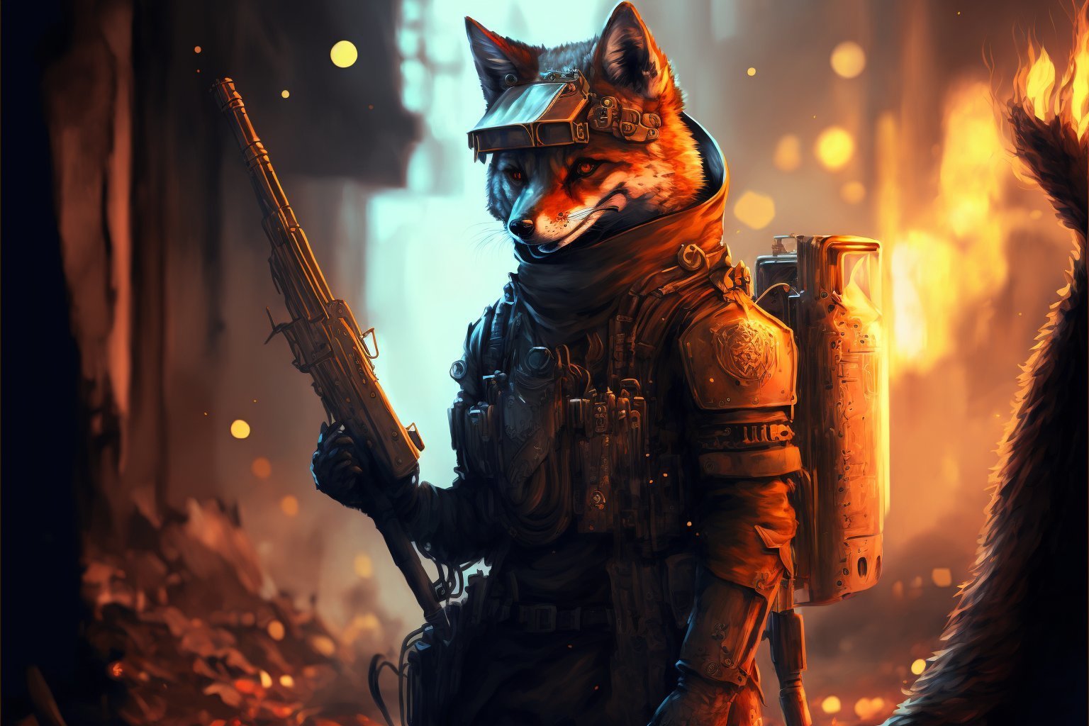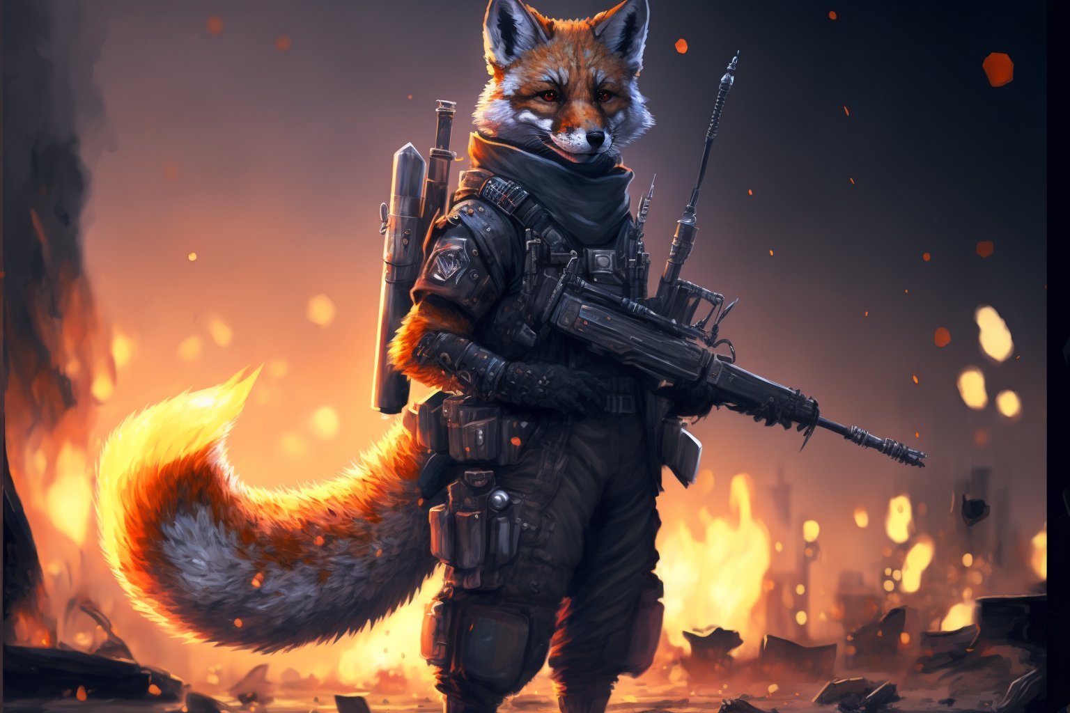 full body picture of a cyberpunk anthropomorphic fox soldier wearing military clothes and holding a fire weaponCa je savais que ca marcherait