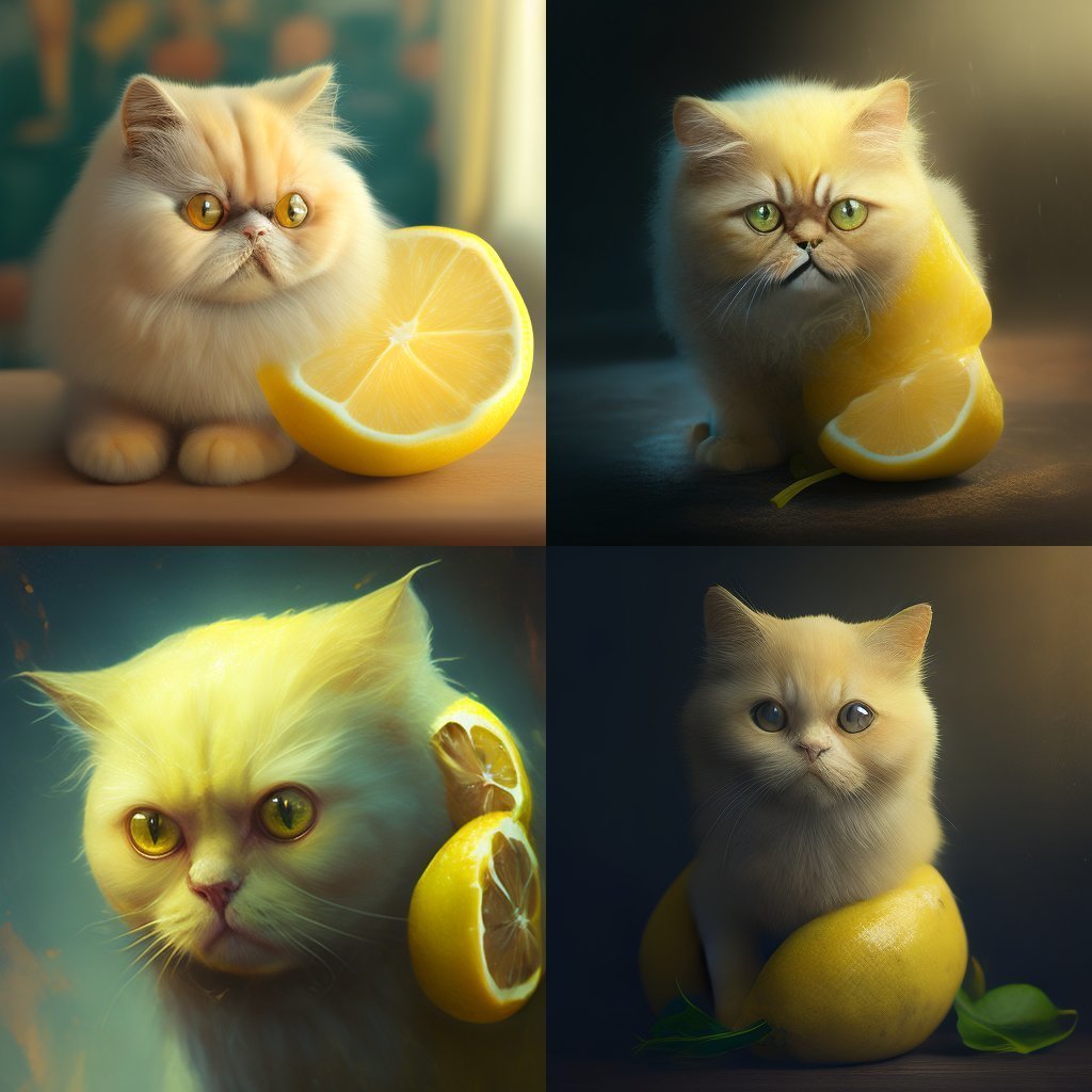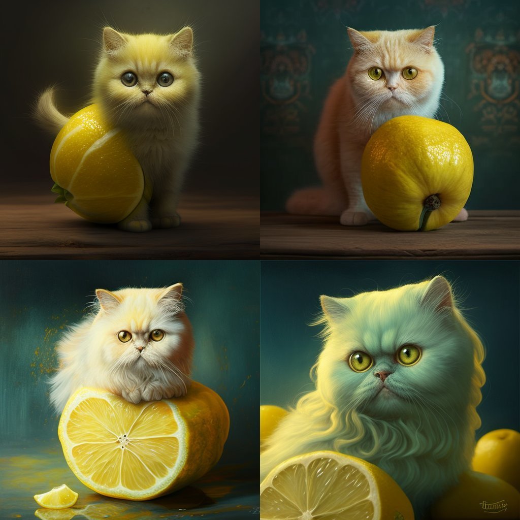 J'ai testé le prompt "lemon cat" en différentes qualité, je vous mets juste la minimum (--q 0.25) et la max (--q 5)La différence n'est pas si folle que ça, mais la qualité 5 va plus loin dans les détails (poils mieux définis, texture du citron,...)