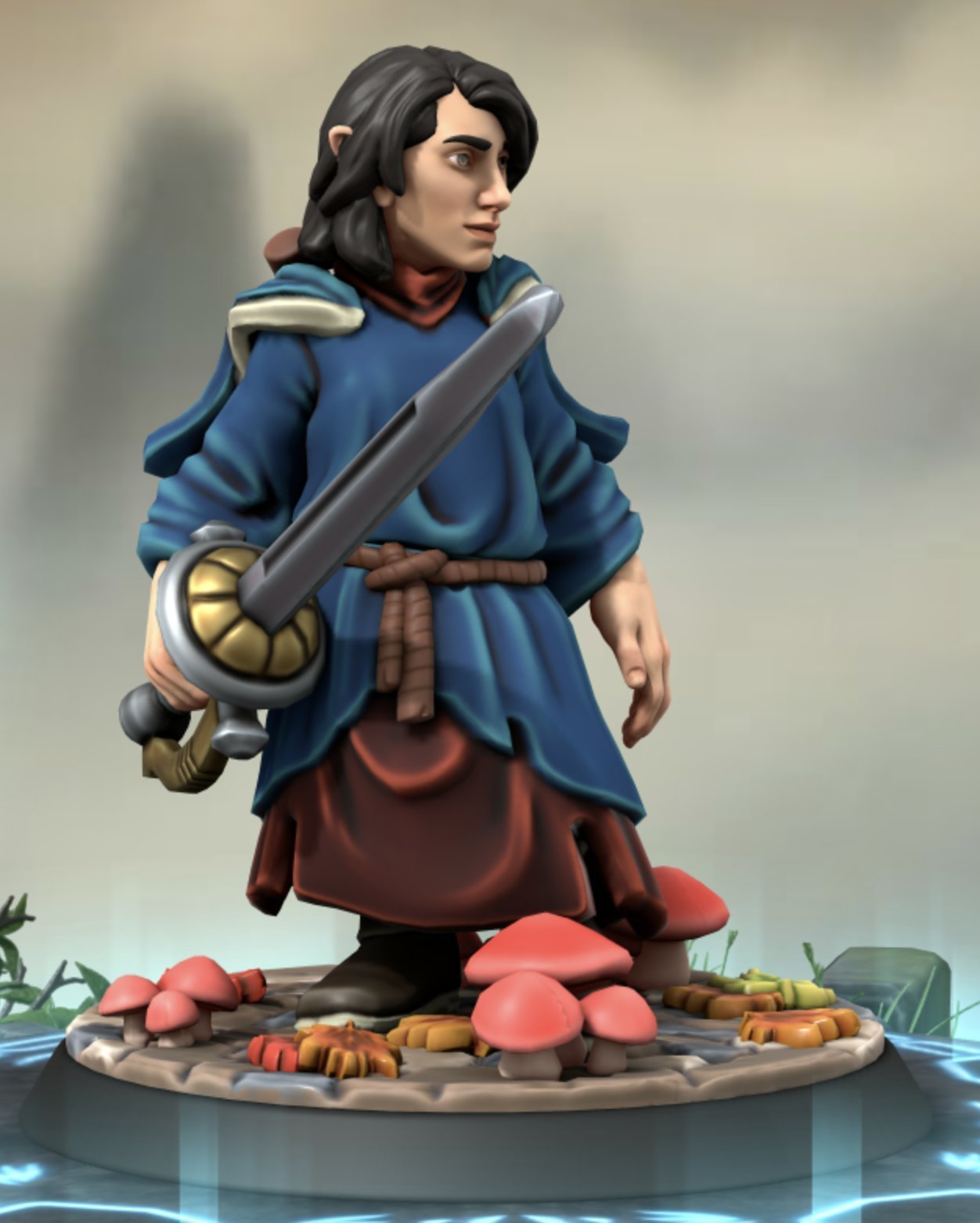 . As you can see, he has a blue dress like a priest, a rapier in his right hand, dark hair, brown eyes. I want him to have a luth attached in his back instead of a flute. The portrait must use light in a chiaroscuro way, and give the whole piece emotional strengh."