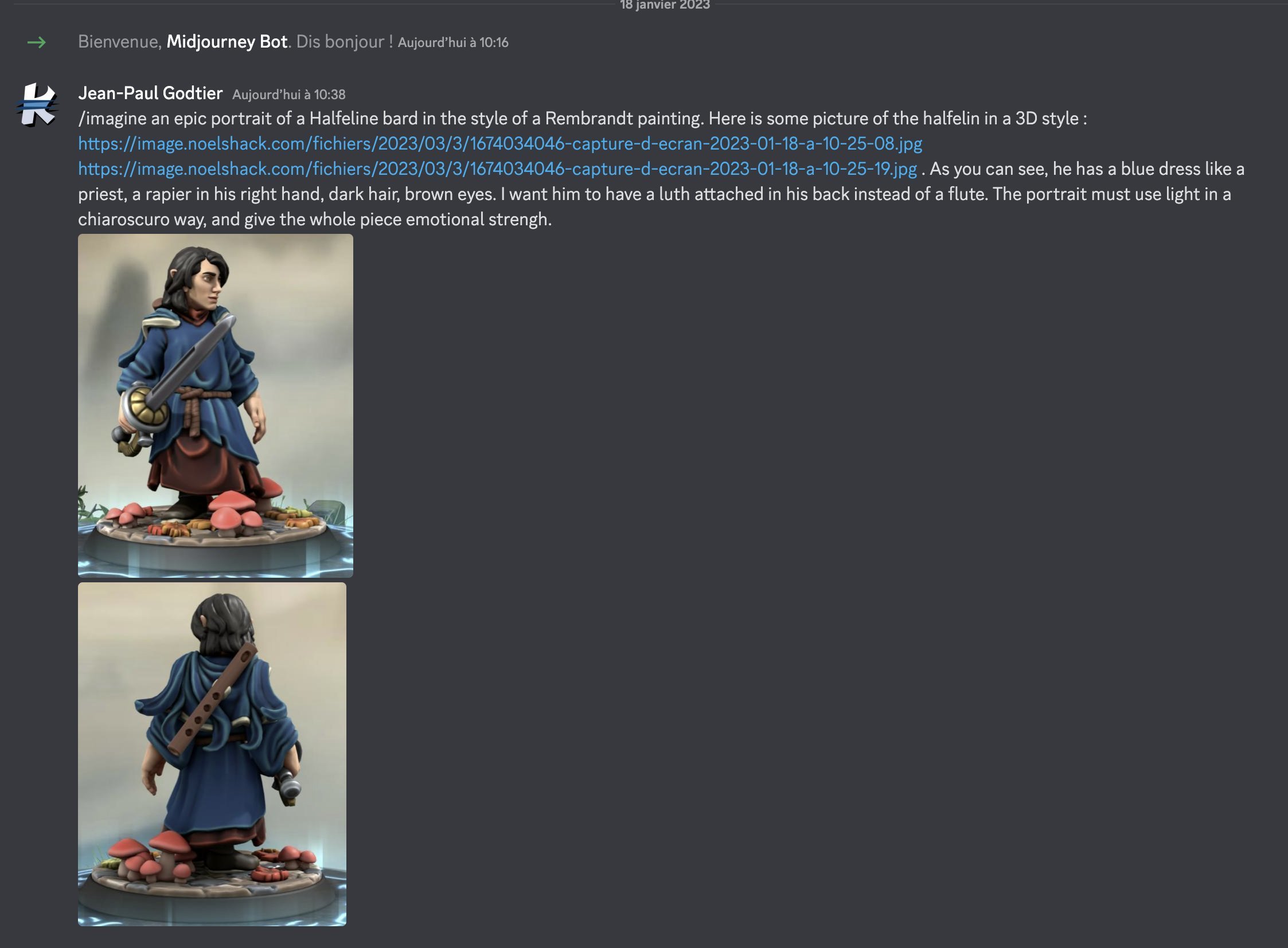Voici le prompt : https://s.mj.run/N-oWh2jjluk epic portrait of a Halfeline bard in the style of a Rembrandt painting, priest blue dress, holding a rapier in his right hand, dark hair, brown eyes, a luth attached in his back, chiaroscuro, strenght posture,