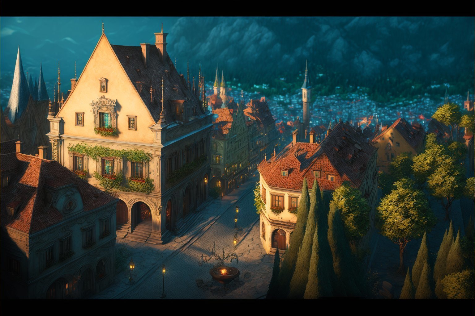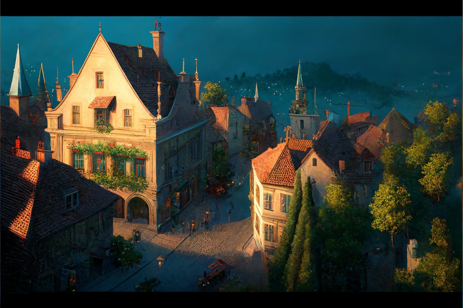 C'est simple: une rue dans une ville dans le style de Beauclair, au crépuscule